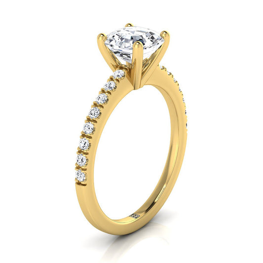 As for settings, our collection offers a selection that will bring out the best in your chosen diamond. The solitaire setting is a timeless classic, allowing the Asscher cut diamond to take center stage and showcase its unique shape and brilliance. Those who desire a touch of extra sparkle might opt for a halo setting, with a circle of smaller diamonds surrounding the center stone, adding brilliance and enhancing its overall beauty. However, for a delicate and intricate look, the French pave setting, with small diamonds set closely together along the band, creates a mesmerizing "paved" effect that enhances the allure of the Asscher-cut diamond.