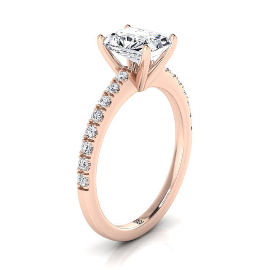 The radiant cut features a luxuriously sparkling appearance with a complex layered look. Its tightly patterned facets and truncated corners form a radiant diamond pillow that rivals the round brilliant in terms of sparkle and brilliance. This captivating cut is often rectangular, but it has also gained popularity as a square shape, offering a uniquely different option for those seeking an extravagant and lavish engagement ring. Its symmetrical yet intricate design exudes a sense of luxury and elegance, making it a truly mesmerizing choice for an engagement ring.