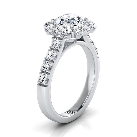 This exquisite white gold diamond engagement ring features an enchanting oval diamond at its heart, enveloped by a petite halo that enhances its shape and allure. The band, adorned with French pave-set diamonds, adds a sparkling elegance, making the ring a masterpiece of light and beauty. The meticulous craftsmanship ensures that each aspect of the design contributes to a breathtaking whole, making it a favorite among those seeking a blend of classic and contemporary styles.