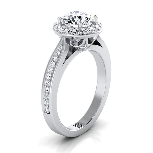 Elevating the concept of a solitaire white gold diamond engagement ring, this design introduces a secret diamond halo beneath the central oval diamond, offering an unexpected delight. The French pave diamond band complements this hidden feature, creating an aura of sophistication and mystery. This ring represents a union of individuality and traditional solitaire design, making it perfect for those who appreciate subtle surprises.