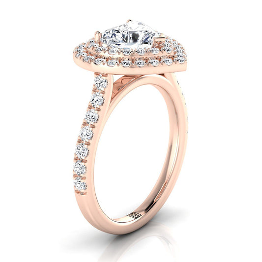 The Halo setting is also a good choice if you're looking for a ring with extra bling. This setting features a ring of smaller diamonds surrounding the central stone, creating a circle or oval surrounding the heart diamond. The effect is a noticeable increase in the apparent size of the diamond as the sparkle and scintillation of the halo enhance the diamond's visual impact. Additionally, the halo setting provides extra protection for the heart cut diamond's pointed tip, minimizing the risk of chipping.
