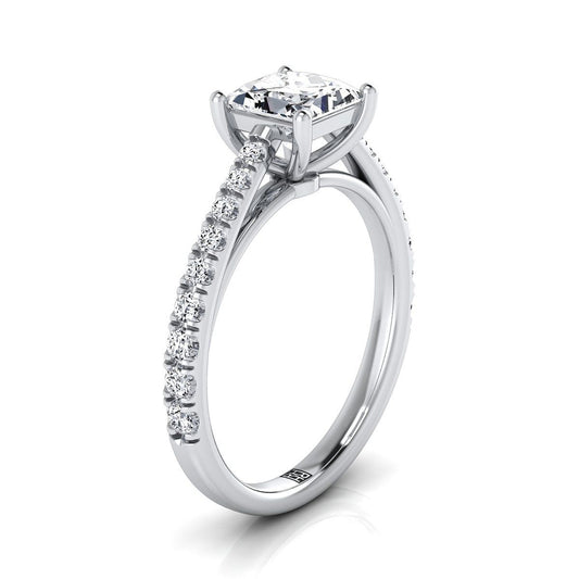 The princess-cut diamond takes center stage in a classic solitaire setting. With its clean lines and timeless elegance, this setting highlights the stone's brilliance and allows it to become the focal point of the ring. A four-prong or six-prong setting ensures the stone is securely held and allows light to penetrate from all angles, enhancing its luminosity.