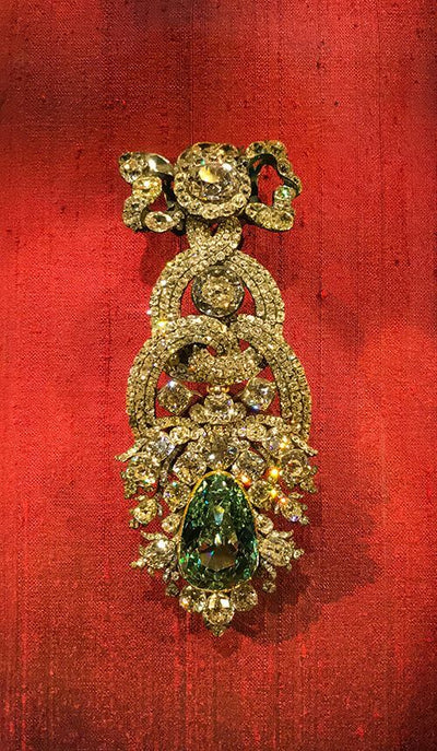 The first mention of the Dresden Green is in a London newspaper in 1722. It was purchased by Friedrich Augustus III, King of Poland in 1742 and set into a badge of the order of the Golden Fleece. In 1768, it was set into the elaborate diamond hat ornament we see today.