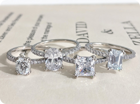 These designs feature accent diamonds flanking the center stone, with pavé bands or tapered baguettes that elevate the glamour and uniqueness of the ring.
