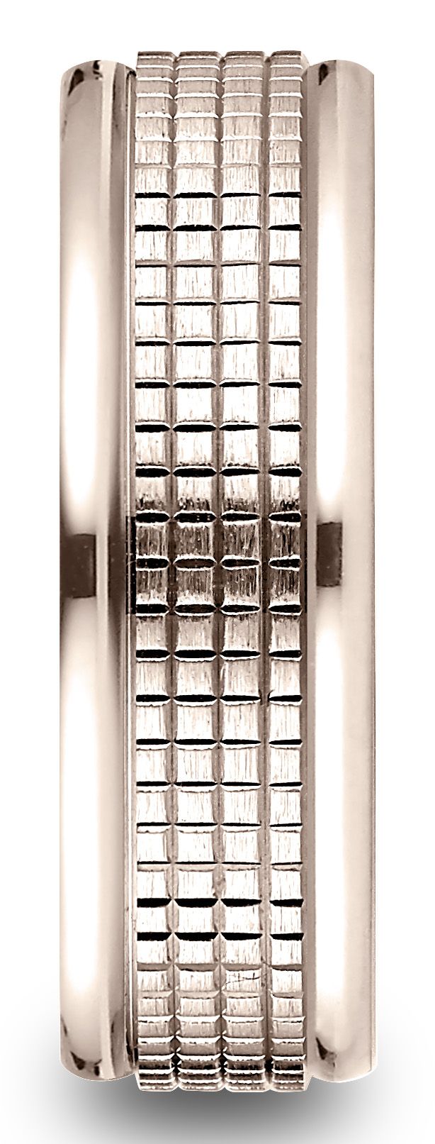 This Refined 14 Karat Rose Gold 7mm Comfort-fit Carved Design Band Features An Intricate Cross Hatch Pattern Center Framed By High Polish Round Edges.