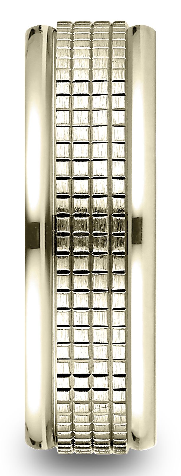 This Refined 14 Karat Yellow Gold 7mm Comfort-fit Carved Design Band Features An Intricate Cross Hatch Pattern Center Framed By High Polish Round Edges.