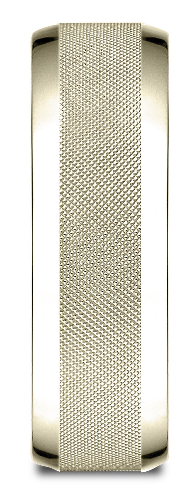This Refined 14 Karat Yellow Gold 7mm Comfort-fit Carved Design Band Features An Intricate Cross Hatch Pattern Center Framed By High Polish Round Edges.
