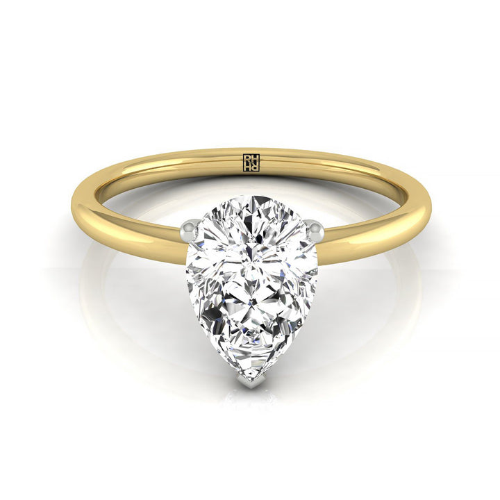 The Exquisite 14k Yellow Gold Pear Engagement Ring Showcases A Captivating Concealed Halo Of 25 Prong Set Round Sparkling Diamonds Encircling The Central Gem, While A Dainty Band Beautifully Complements The Intricate Design For A Stylish And Sophisticated Appearance.