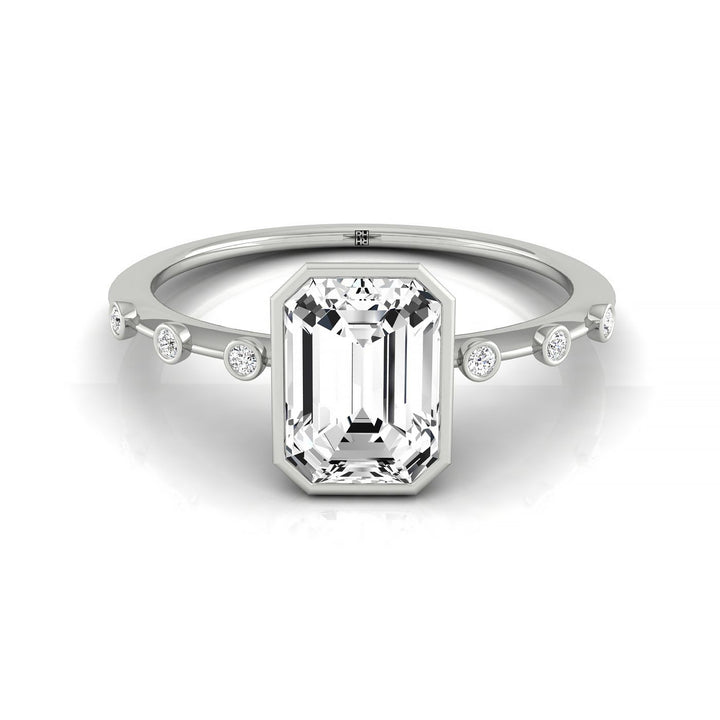 18kw Bezel Set Emerald Engagement Ring With 6 Bezel Set Round Diamonds On Shank