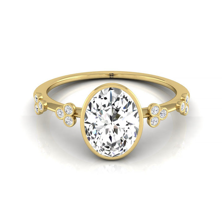 18ky Bezel Set Oval Engagement Ring With 12 Clover Bezel Set Round Diamonds On Shank