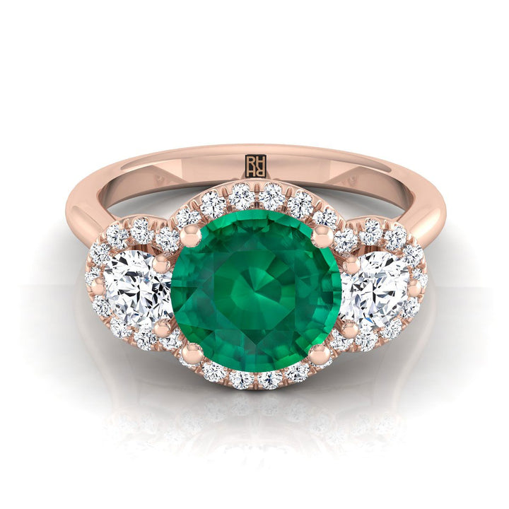 14K Rose Gold Round Brilliant Emerald French Pave Diamond Three Stone Engagement Ring -1/2ctw