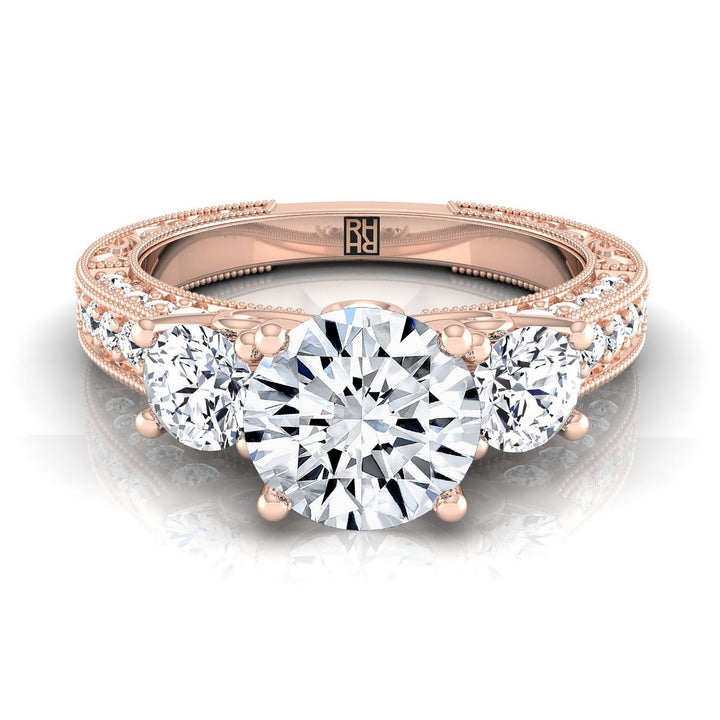 14K Rose Gold Round Brilliant Vintage Three Stone Antique Scroll Beaded Engagement Ring -7/8ctw