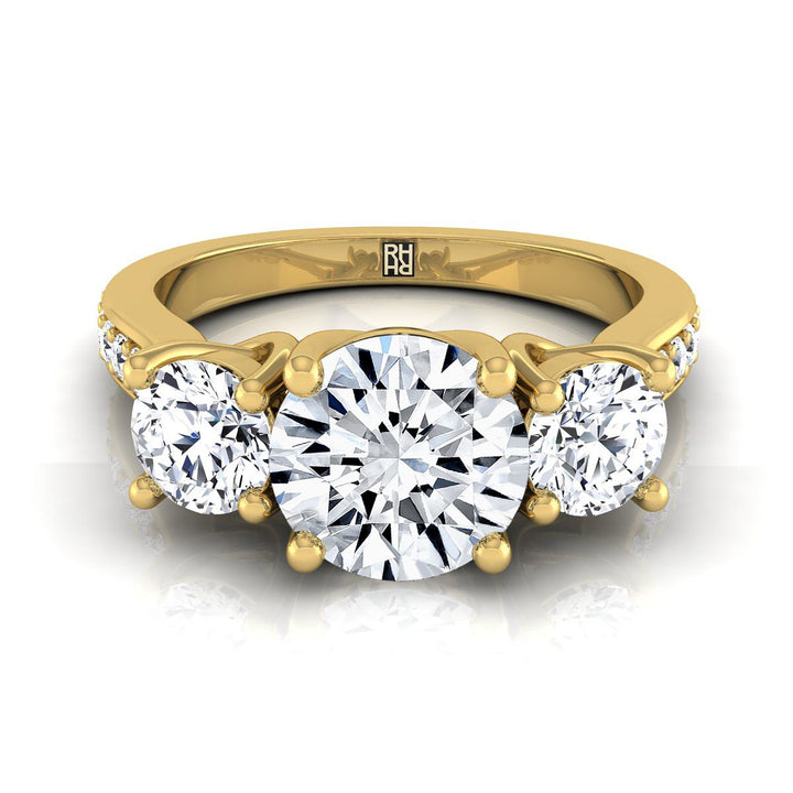 14K Yellow Gold Round Brilliant Diamond Three Stone Classic with Channel French Pave Engagement Ring -7/8ctw