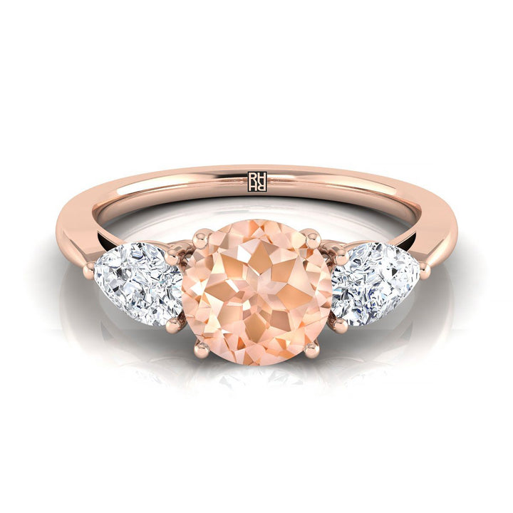 14K Rose Gold Round Brilliant Morganite Perfectly Matched Pear Shaped Three Diamond Engagement Ring -7/8ctw