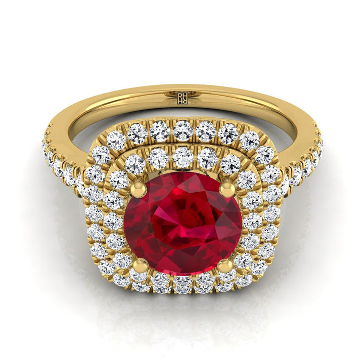14K Yellow Gold Round Brilliant Ruby Double Halo with Scalloped Pavé Diamond Engagement Ring -1/2ctw