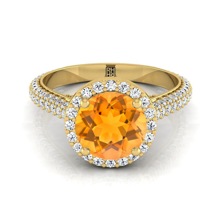 18K Yellow Gold Round Brilliant Citrine Micro-Pavé Halo With Pave Side Diamond Engagement Ring -7/8ctw