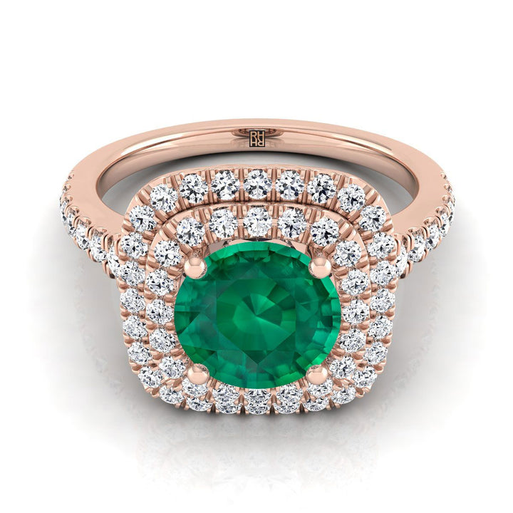 14K Rose Gold Round Brilliant Emerald Double Halo with Scalloped Pavé Diamond Engagement Ring -1/2ctw