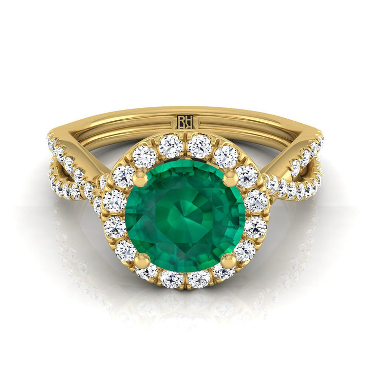18K Yellow Gold Round Brilliant Emerald  Twisted Scalloped Pavé Diamonds Halo Engagement Ring -1/2ctw