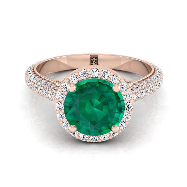 14K Rose Gold Round Brilliant Emerald Micro-Pavé Halo With Pave Side Diamond Engagement Ring -7/8ctw