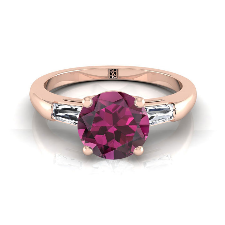 14K Rose Gold Round Brilliant Garnet Three Stone Tapered Baguette Engagement Ring -1/5ctw