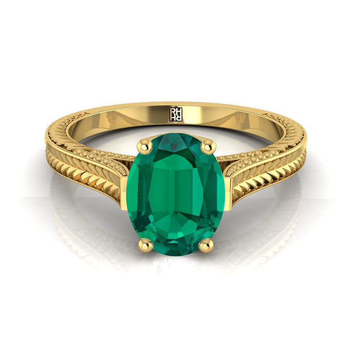 14K Yellow Gold Oval Emerald Hand Engraved Vintage Cathedral Style Solitaire Engagement Ring