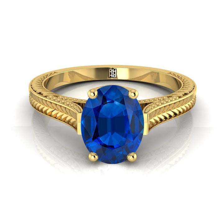 14K Yellow Gold Oval Sapphire Hand Engraved Vintage Cathedral Style Solitaire Engagement Ring