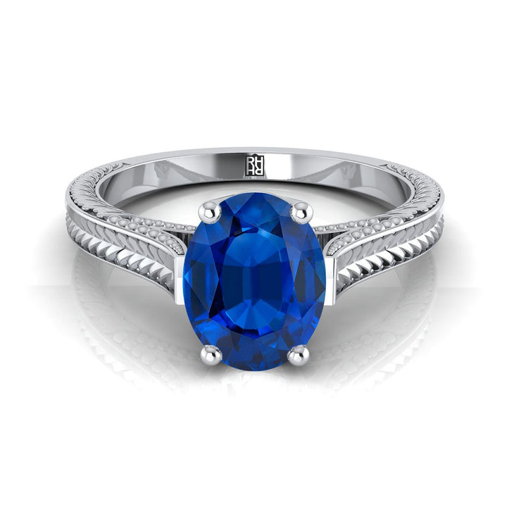 18K White Gold Oval Sapphire Hand Engraved Vintage Cathedral Style Solitaire Engagement Ring