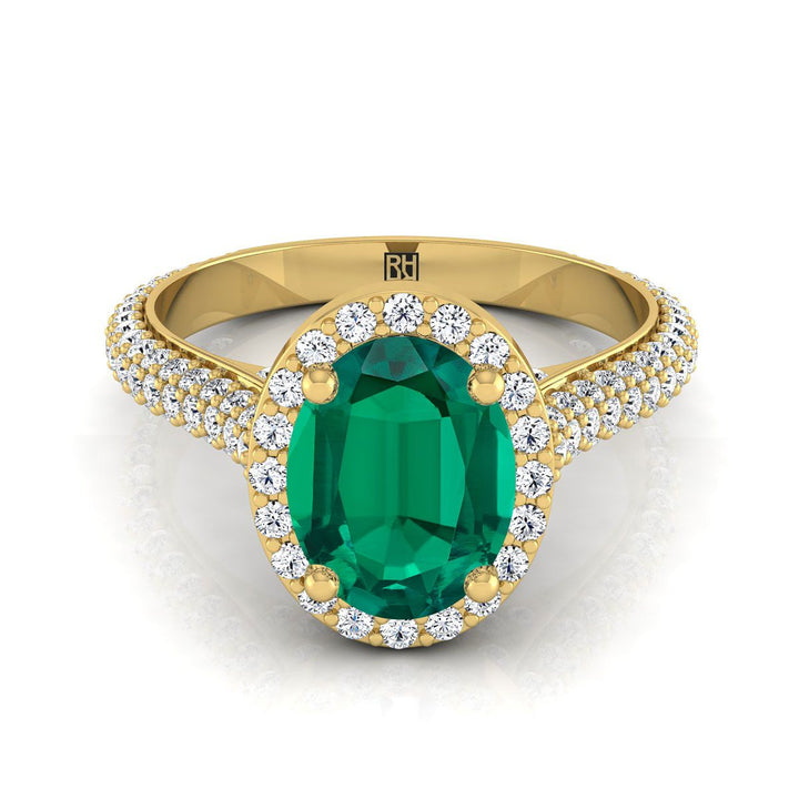 18K Yellow Gold Oval Emerald Micro-Pavé Halo With Pave Side Diamond Engagement Ring -7/8ctw