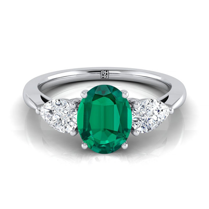 14K White Gold Oval Emerald Perfectly Matched Pear Shaped Three Diamond Engagement Ring -7/8ctw