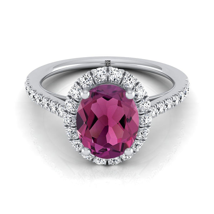 14K White Gold Oval Garnet Petite Halo French Diamond Pave Engagement Ring -3/8ctw
