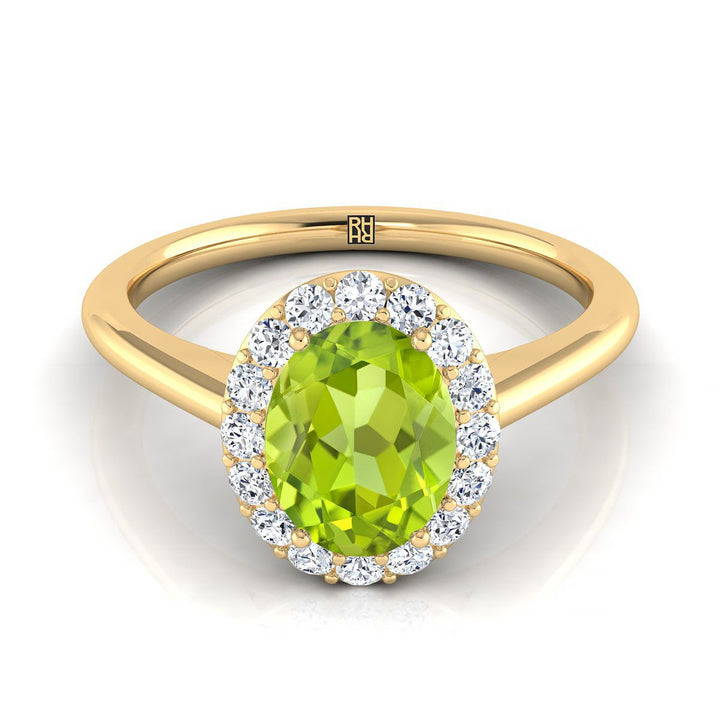 18K Yellow Gold Oval Peridot Shared Prong Diamond Halo Engagement Ring -1/5ctw