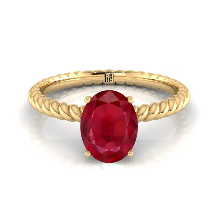 18k Yellow Gold Center Engagement Ring With 8 X 6mm Oval Ruby Center Stone And Rope Design Shank