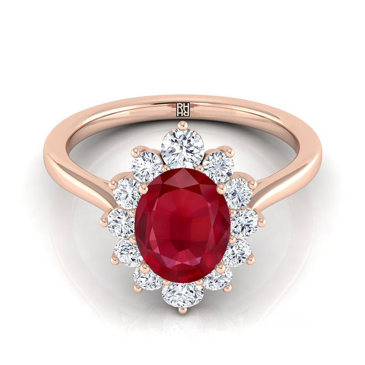 14k Rose Gold Engagement Ring With 8 X 6mm Oval Ruby Center Stone And 12 Brilliant Cut Diamonds Weighing 0.48ctw