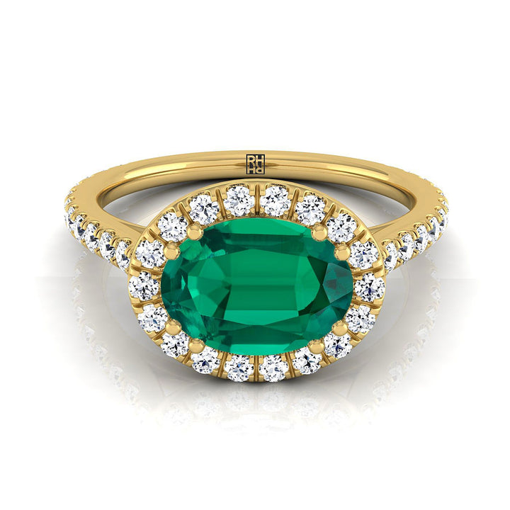 18K Yellow Gold Oval Emerald Horizontal Fancy East West Diamond Halo Engagement Ring -1/2ctw