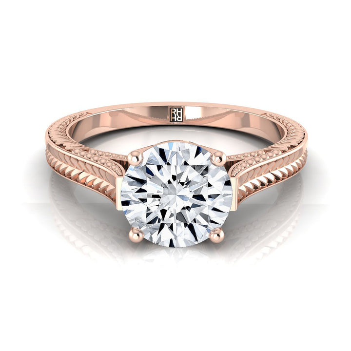 14K Rose Gold Round Brilliant Hand Engraved Vintage Cathedral Style Solitaire Engagement Ring