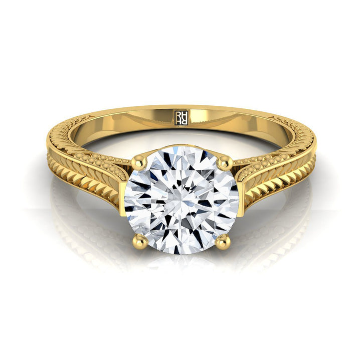 14K Yellow Gold Round Brilliant Hand Engraved Vintage Cathedral Style Solitaire Engagement Ring