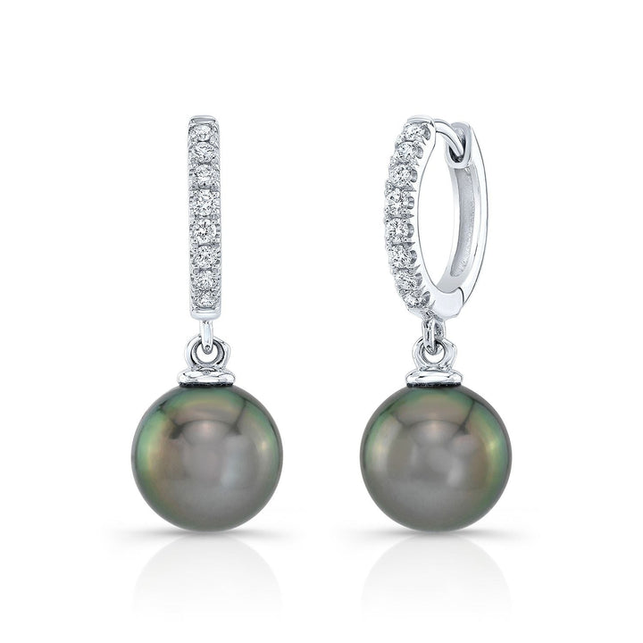 14k White Gold Earrings With 2 Black South Sea Pearls At 8.0-8.5mm And 16 Round Brilliant Diamonds Weighing 0.20ctw (si)