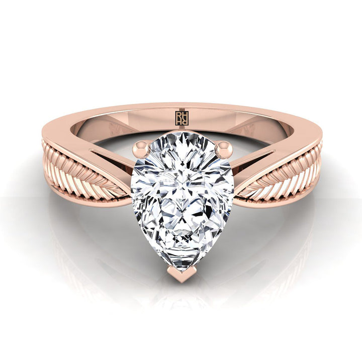14K Rose Gold Pear Shape Center Vintage Inspired Leaf Pattern Pinched Solitaire Engagement Ring
