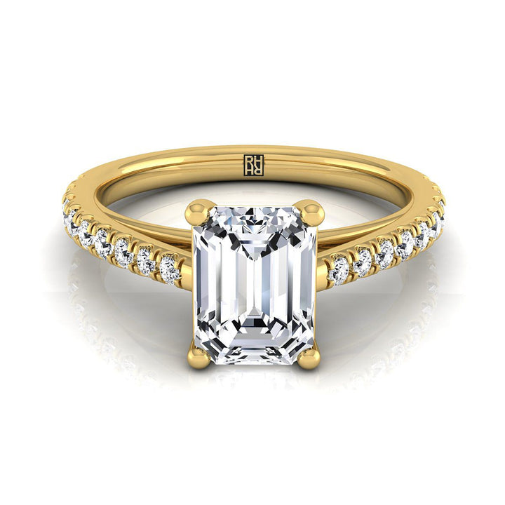 14K Yellow Gold Emerald Cut Diamond French Pave Cathedral Style Solitaire Engagement Ring -1/4ctw