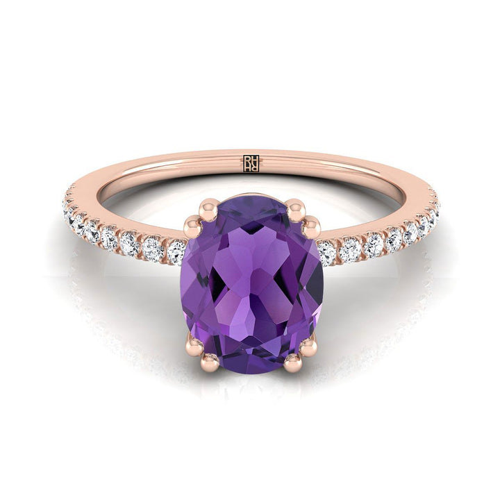 14K Rose Gold Oval Amethyst Simple French Pave Double Claw Prong Diamond Engagement Ring -1/6ctw