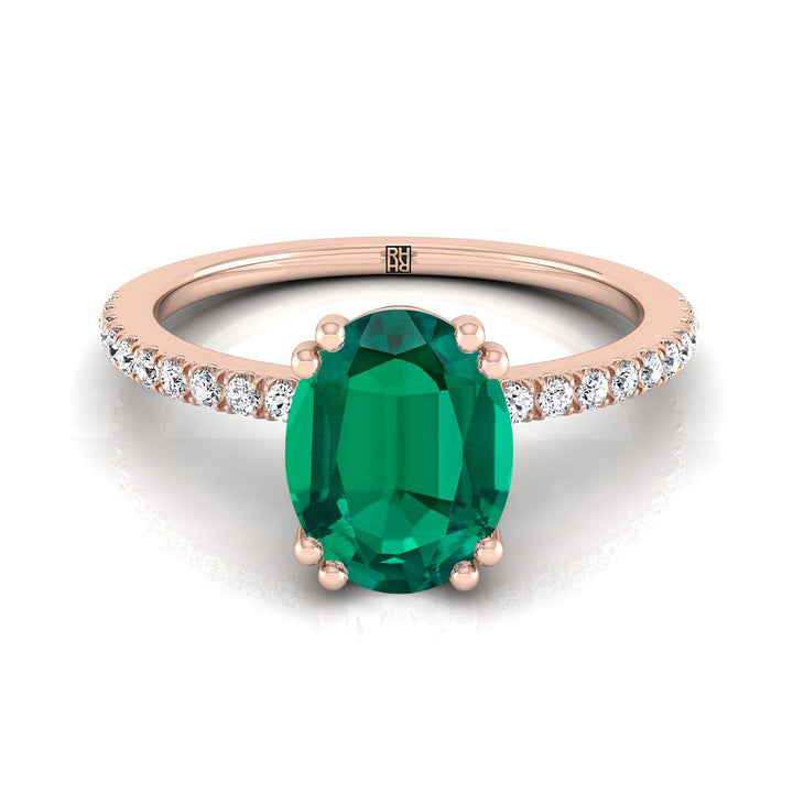 14K Rose Gold Oval Emerald Simple French Pave Double Claw Prong Diamond Engagement Ring -1/6ctw