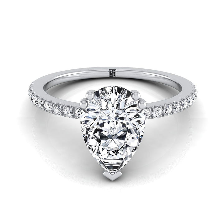 Platinum Pear Shape Center Diamond Simple French Pave Double Claw Prong Engagement Ring -1/6ctw