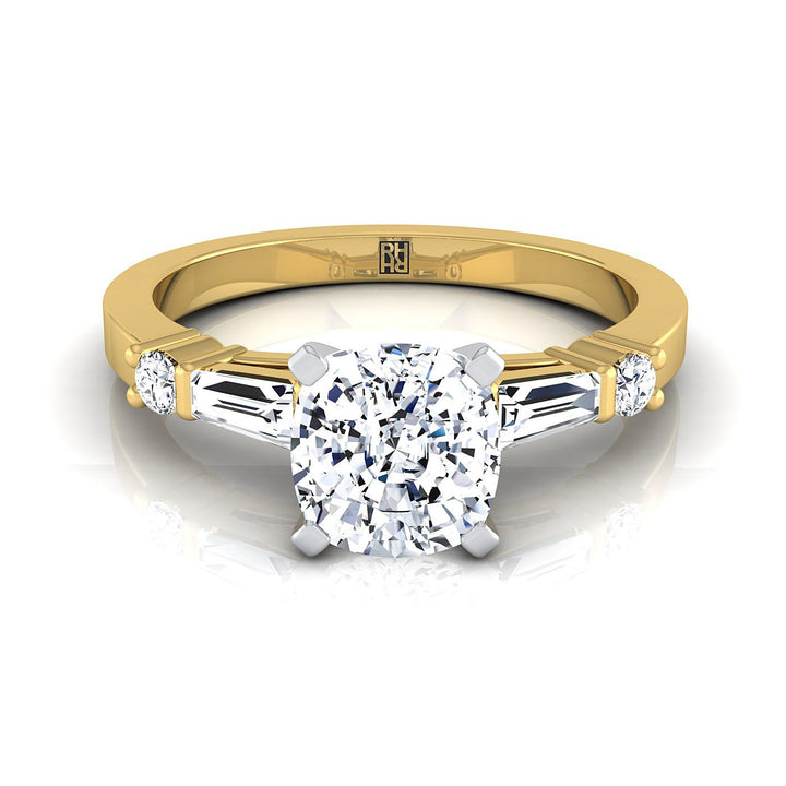 14K Yellow Gold Cushion Diamond Simple Baguette and Round Solitaire Engagement Ring -1/4ctw