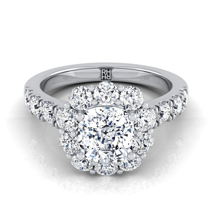 14K White Gold Cushion Diamond Luxe Style French Pave Halo Engagement Ring -1-1/10ctw