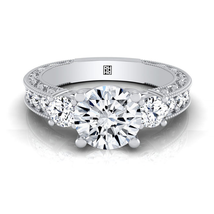 14K White Gold Round Brilliant Diamond Hand Engraved Three Stone Vintage Channel Engagement Ring -3/4ctw
