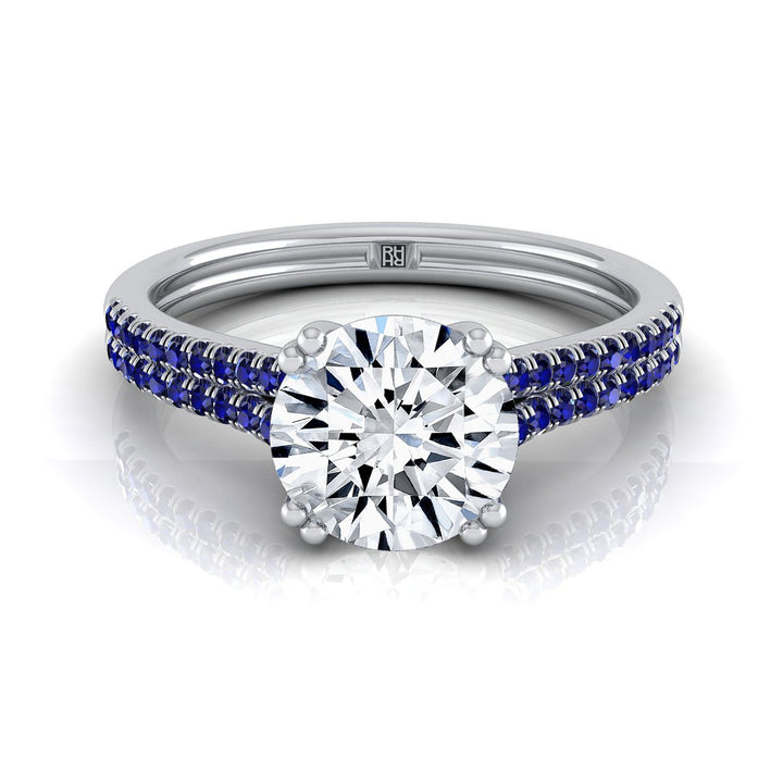 Exquisitely Handcrafted, This Engagement Ring Showcases Round Sapphires Beautifully Micro U Pave Set In A Classic 18k White Gold Setting.