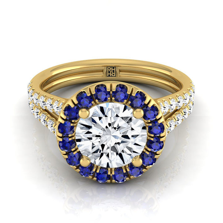 An Elegant Statement Of Style, This Diamond With Sapphire Accented Halo Engagement Ring Showcases Brilliant Cut Diamonds (h-i/vs 0.40ctw) With An Exquisite Pave Split Shank Mounted In A 14k Yellow Gold Setting.