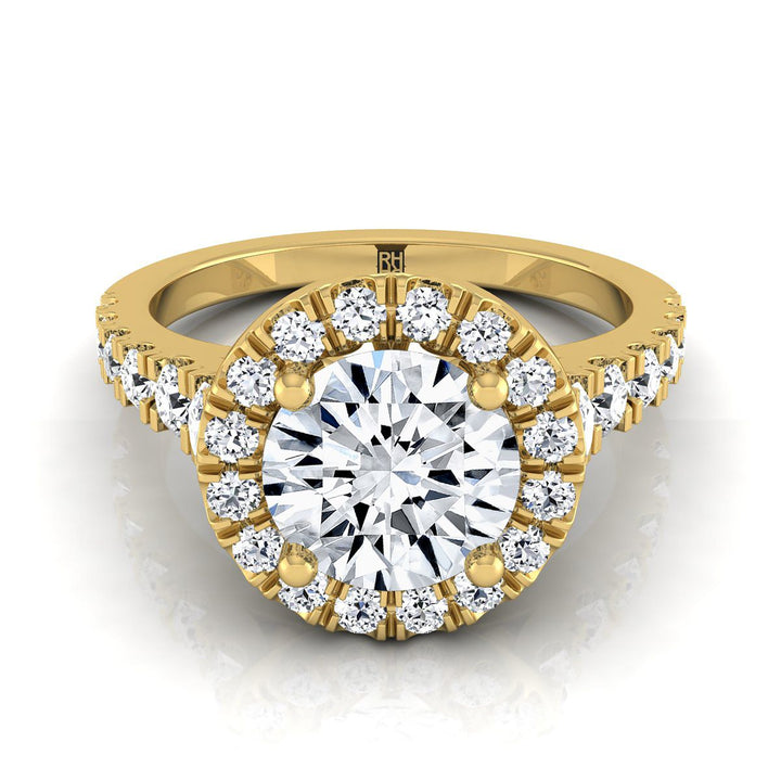14K Yellow Gold Round Brilliant Diamond Shared Prong Halo and Linear Side Set Diamond Engagement Ring -5/8ctw