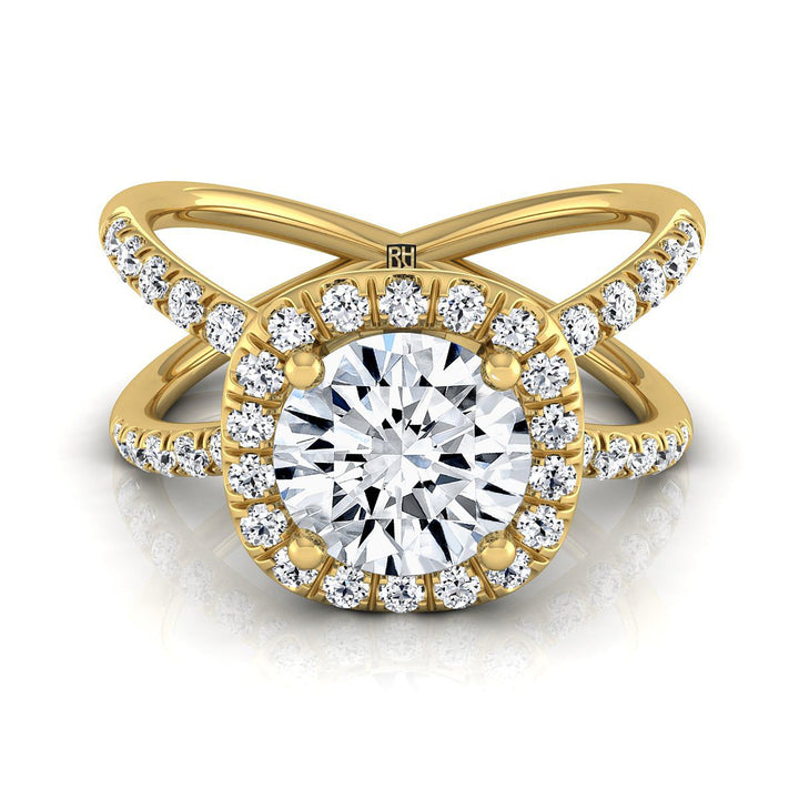 14K Yellow Gold Round Brilliant Diamond Open Criss Cross French Pave Engagement Ring -1/2ctw