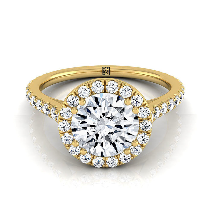Classic And Elegant, This Diamond Halo Engagement Ring With A Pave Shank Showcases Brilliant Cut Diamonds (h-i/vs 0.45ctw) Beautifully Set In A Classic 14k Yellow Gold Setting.